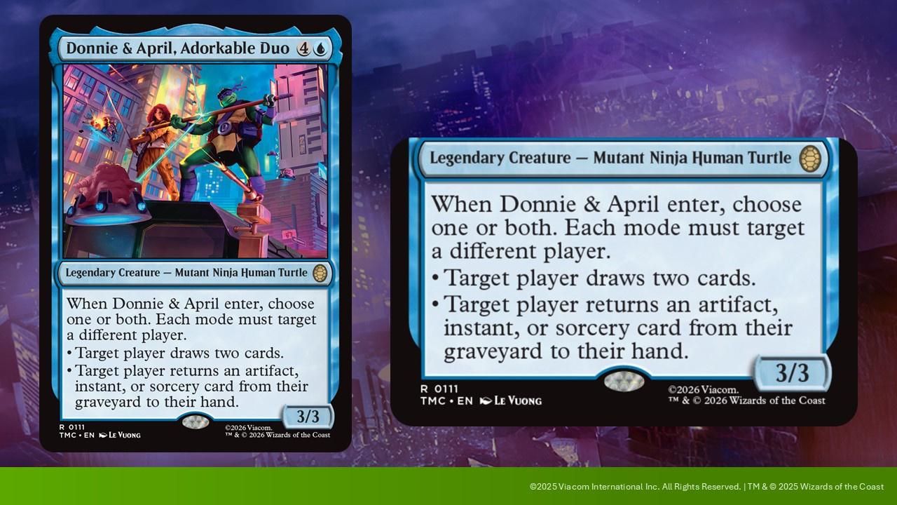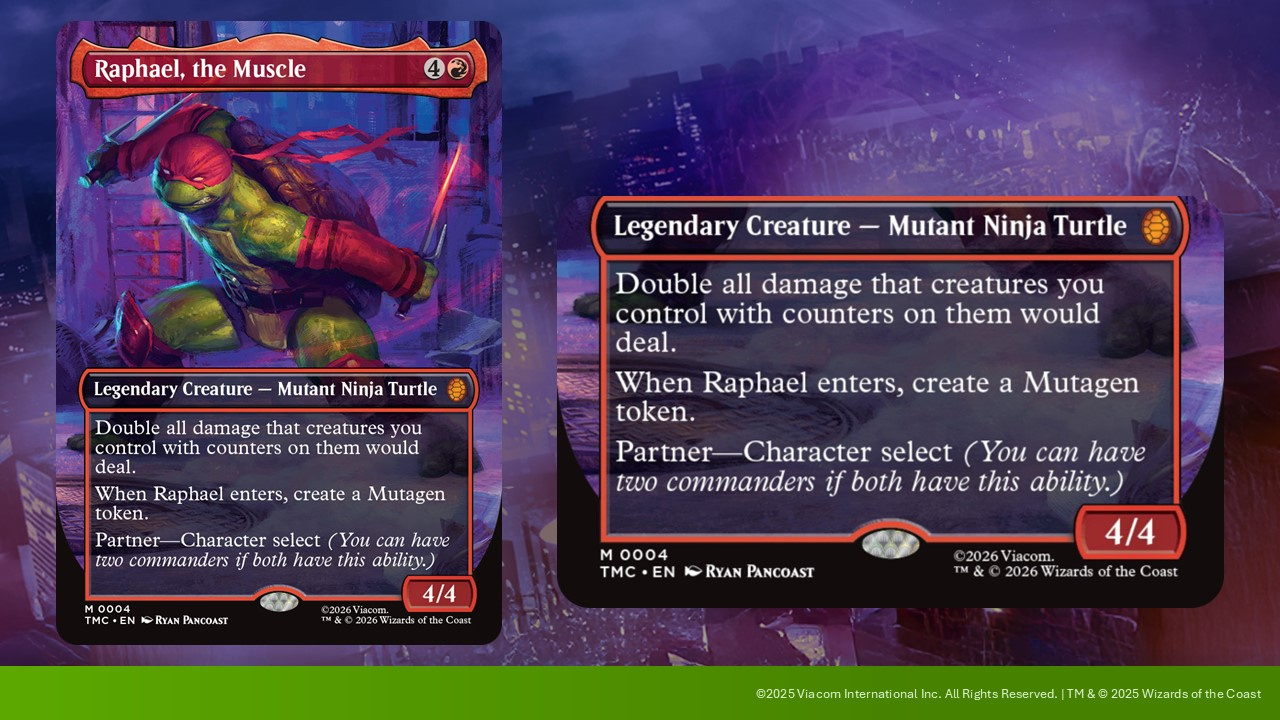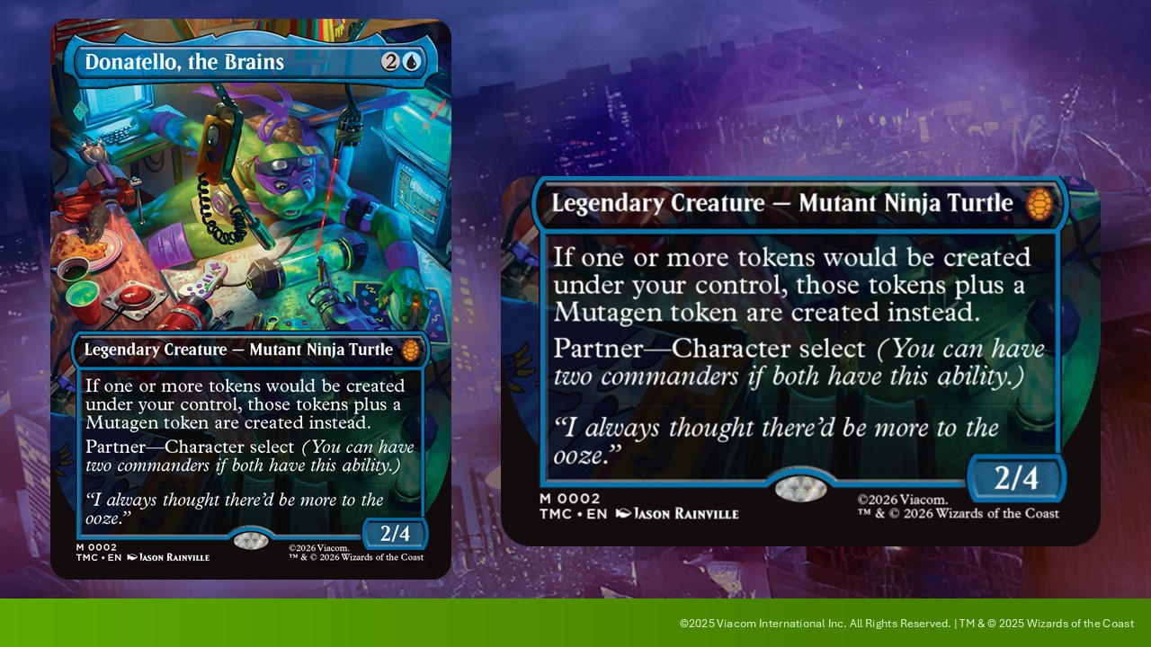 The Magic: The Gathering | Teenage Mutant Ninja Turtles set, coded TMT, is designed to appeal to a broad audience, from longtime Magic players to Turtle superfans. Drawing inspiration from the entire history of the Teenage Mutant Ninja Turtles franchise, the set includes cards and products that celebrate the adventures of Leonardo, Donatello, Raphael, and Michelangelo across various media, from Kevin Eastman’s original comics to recent animated incarnations. The set is legal in all Magic formats, with additional Eternal-legal sets (TMC and PZA) playable in Commander, Legacy, and Vintage formats. Cards from TMT and PZA are also included in Play Boosters, making them usable in Draft and Sealed events.